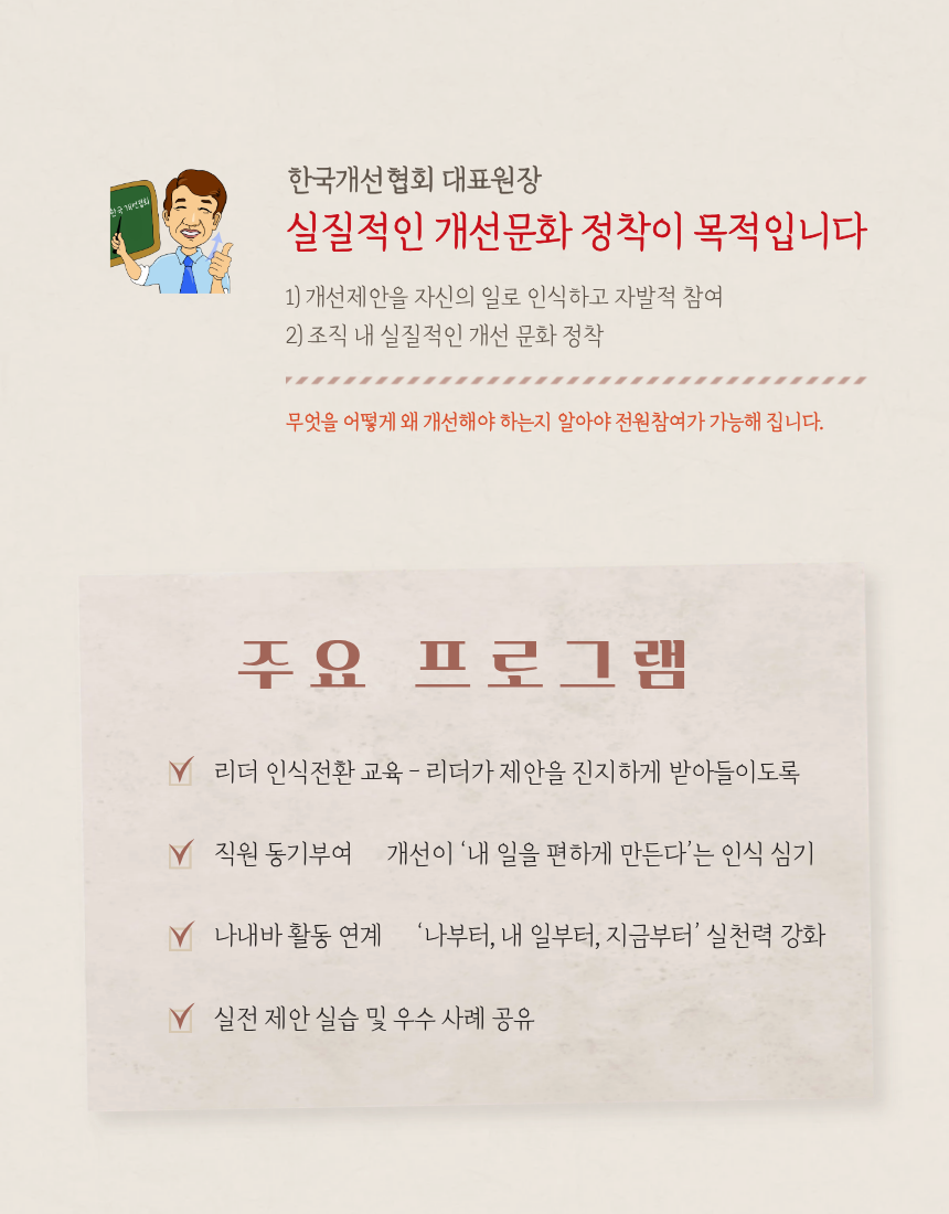 사단법인 한국개선협회는 개선제안 활성화 전문교육기관입니다. 02-532-2841